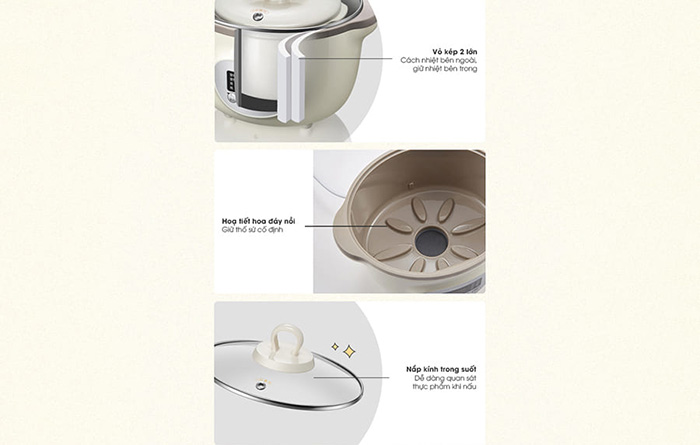 - Có thiết kế nhỏ gọn vô cùng bắt mắt. Kết cấu nồi bao gồm 1 nồi sứ lớn 1,6L và 02 nồi sứ nhỏ 0,5L, 1 vỏ nồi chất liệu ABS với tông màu sáng, 1 lồng hấp dùng để hấp rau củ và bánh bao trong lúc nấu cháo siêu tiện lợi.