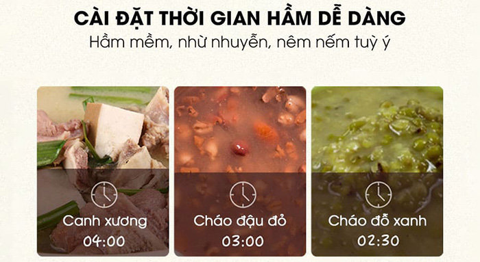 - Nồi nấu chậm Bear còn được tích hợp tính năng hẹn giờ nấu thông minh. Với tính năng hẹn giờ dài và tự động chuyển sang chế độ giữ ấm khi nấu xong, mẹ có thể chuẩn bị cháo cho bé từ tối hôm trước và chọn chế độ nấu hẹn giờ, sáng hôm sau không cần dậy sớm tất bật mà bé yêu vẫn có món cháo bổ dưỡng.