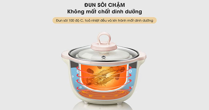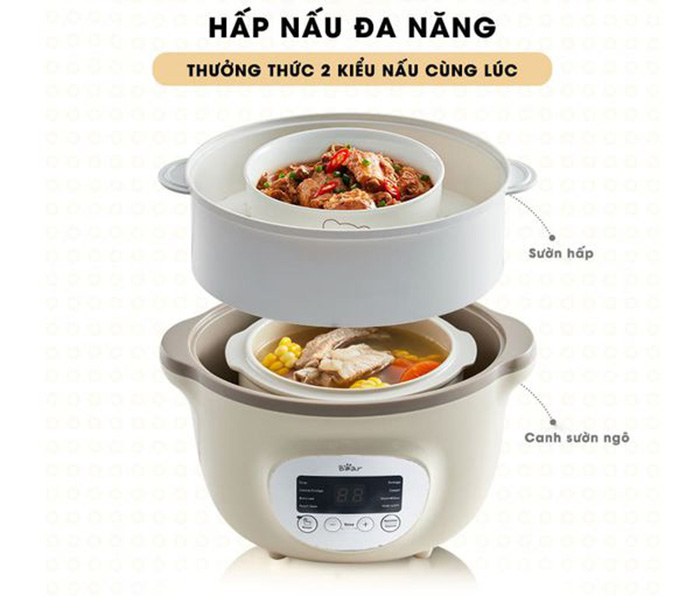 - Điểm đặc biệt của nồi nấu chậm Bear là sử dụng phương pháp nấu cách thủy. Ưu điểm của việc nấu cách thủy là giúp thức ăn chín từ từ, không bị biến đổi chất, không bị bay hơi mất chất dinh dưỡng trong quá trình nấu.