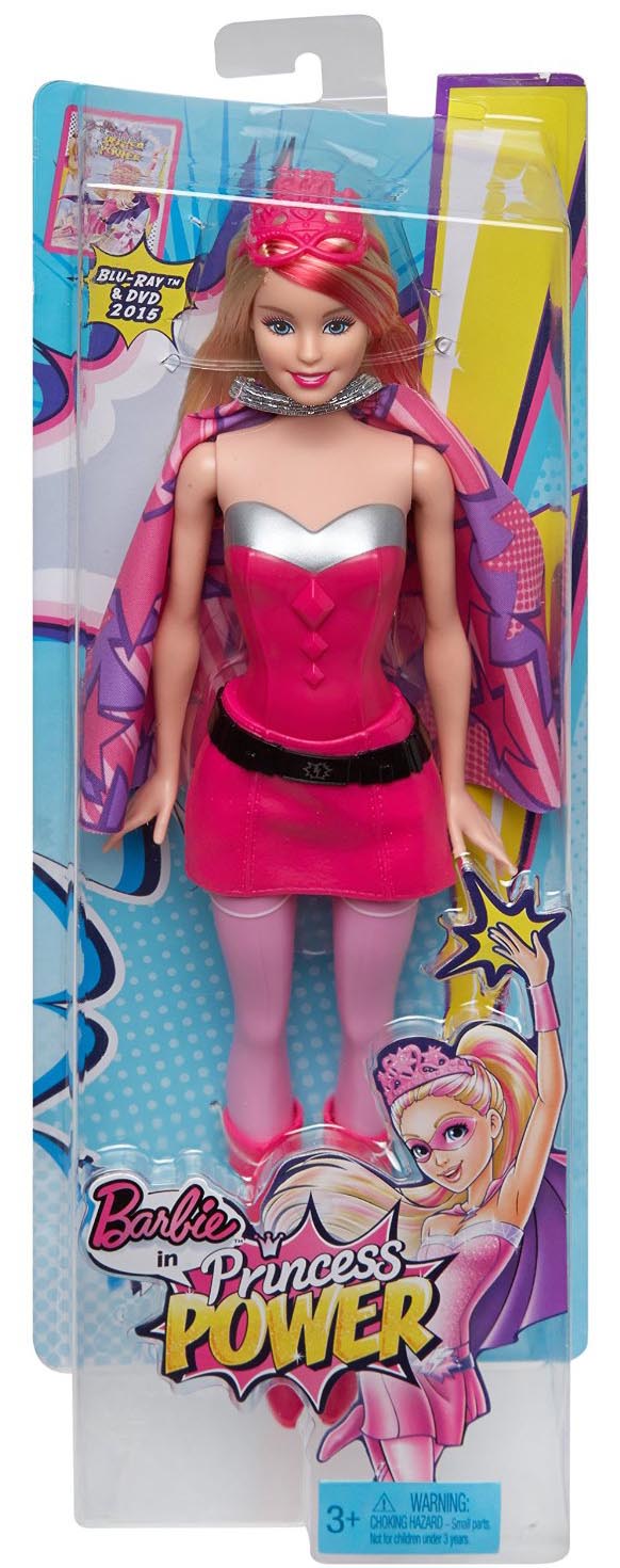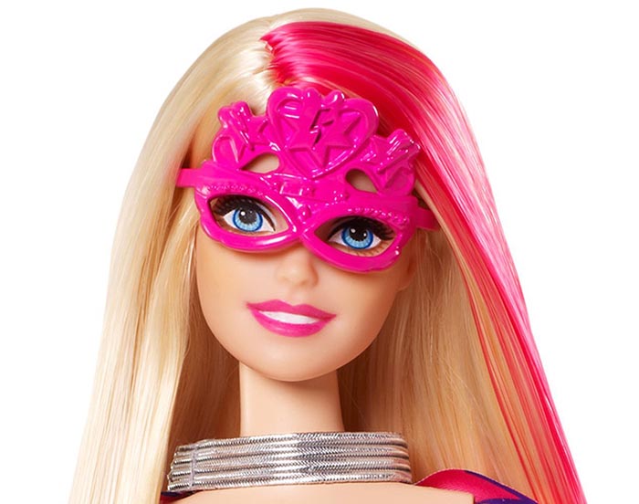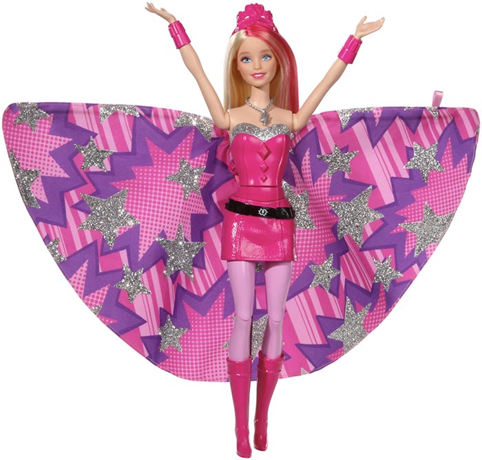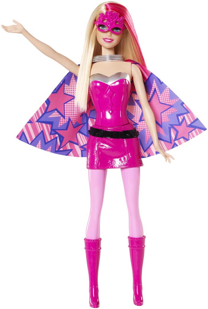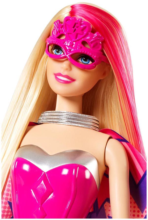 Búp bê siêu nhân barbie lấp lánh với một cô búp bê có mái dài móc lai màu đỏ – vàng, bồng bềnh óng mượt kèm theo một chiếc mặt nạ màu hồng rất đẹp mắt. Trang phục cho búp bê là một chiếc áo cúp ngực và chiếc váy cá tính. Phụ kiện đi kèm là chiếc vòng cổ màu bạc, đôi cánh màu hồng xinh đẹp có các hình ngôi sao. Kèm theo là đôi giày bốt màu hồng đậm năng động.