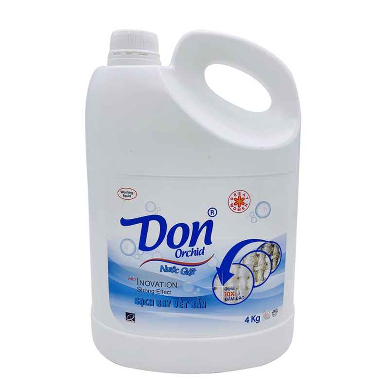 Nước giặt DON ORCHID 4kg (màu trắng) với công thức 10x đậm đặc giúp giặt sạch và tiết kiệm hơn. Với tính năng kháng khuẩn, chống viêm từ các nguyên liệu tự nhiên, sản phẩm rất an toàn với làn da. Sản phẩm không chứa hóa chất độc hại: paraben, chất làm trắng quang học, chlor, phthalate, phosphate, màu tổng hợp.