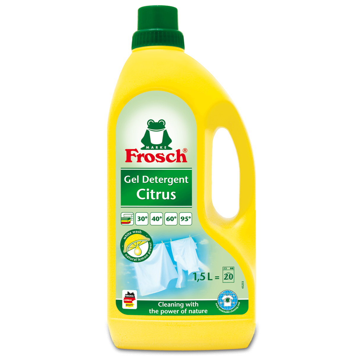 - Nước giặt hương cam chanh Frosch 1500ml làm sạch cực mạnh cho các loại quần áo từ 30° đến 95°C.