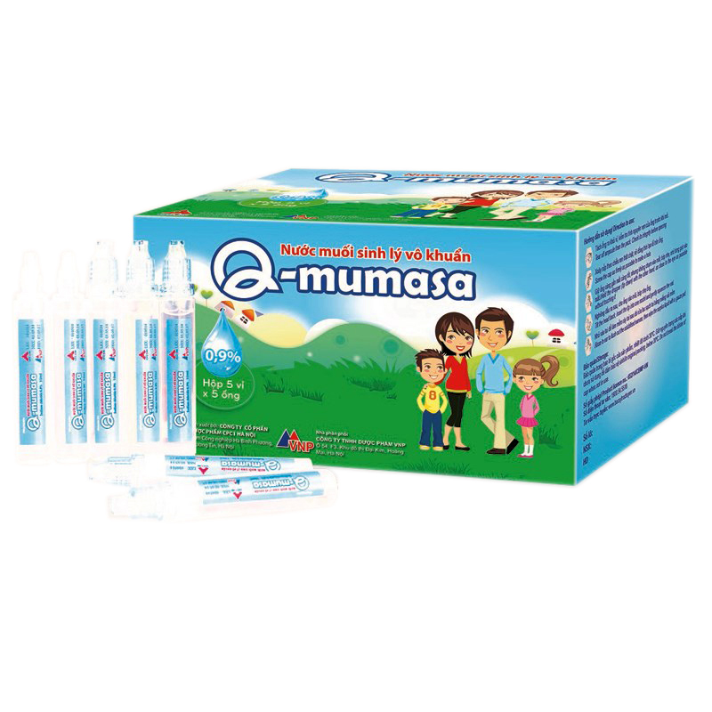Nước muối sinh lý vô khuẩn Q-mumasa (xanh) được sản xuất bằng công nghệ BFS (Blow/Fill/Seal) hoàn toàn tự động, đạt tiêu chuẩn vô khuẩn của nước cất pha tiêm dùng trong y tế. Các mẹ có thể dùng dung dịch nước muối để rửa mũi khi viêm mũi xoang, súc miệng khi bị viêm họng làm sạch vết thương hở, loại bỏ chất bẩn không làm đau xót vết thương của trẻ.
