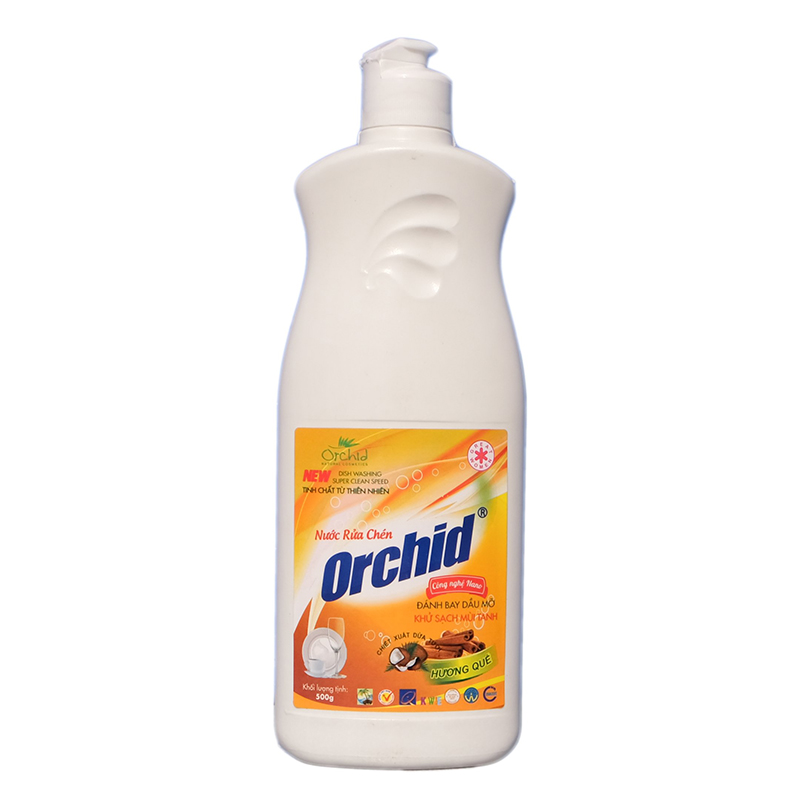 Nước rửa chén Orchid 500ml (hương quế) đánh bay vết dầu mỡ trên bát đĩa, loại bỏ vi khuẩn, khử mùi tanh, mùi thức ăn nhờ hương chanh tự nhiên thơm mát. Không hại da tay, không độc hại cho nguồn nước. Đã được xuất khẩu sang Nhật Bản và nhiều nước khác.