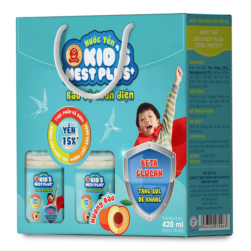 - Lốc nước yến Kid's Nest Plus+ bao gồm 6 lọ với thể tích 70ml/lọ, đóng hộp đẹp mắt và tiện lợi với quai xách.