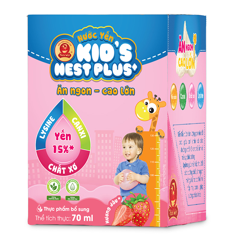 Nước yến Kid's Nest Plus+ hương dâu (70ml) được chế biến từ nguồn tổ yến vùng đảo Cù Lao Chàm danh tiếng, nơi đây yến cho giá trị dinh dưỡng lớn hơn các vùng khác. Sản phẩm bổ sung Canxi, Lysine và chất xơ hỗ trợ tốt cho đường tiêu hóa và hấp thu của trẻ, thích hợp hỗ trợ trẻ biếng ăn, suy dinh dưỡng. Hương vị dâu thơm ngon hòa cùng tính thanh mát, ngọt dịu của yến sào, kích thích vị giác làm nên bữa ăn ngon miệng cho bé.