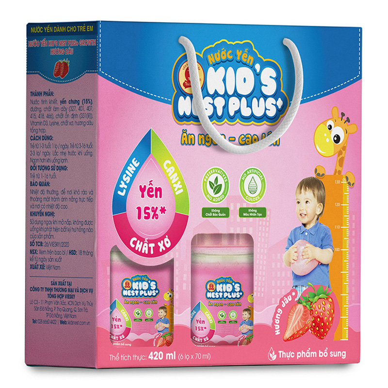 - Lốc nước yến Kid's Nest Plus+ bao gồm 6 lọ với thể tích 70ml/lọ, đóng hộp đẹp mắt và tiện lợi với quai xách.