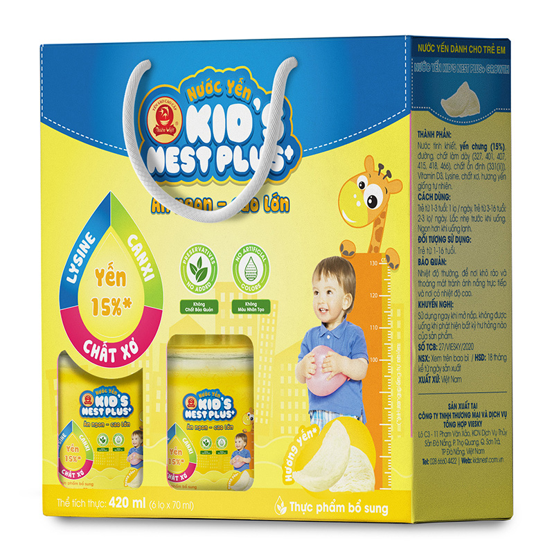 - Lốc nước yến Kid's Nest Plus+ bao gồm 6 lọ với thể tích 70ml/lọ, đóng hộp đẹp mắt và tiện lợi với quai xách.