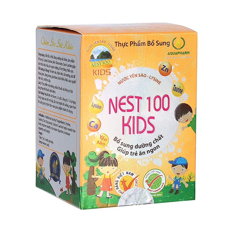 Nước yến sào Nest 100kids - cho trẻ em trên 1 tuổi được chế biến từ yến sào chưng với đường phèn, kết hợp với L-lysine, Taurin, DHA, Kẽm gluconat, Canxi lactate giúp kích thích trẻ ăn ngon miệng, bồi bổ các chất dinh dưỡng cho trẻ kém ăn chậm lớn, còi xương, tăng cường sức đề kháng cho trẻ, giúp tăng chiều cao, phát triển trí não. NEST 100 KIDS được chế biến theo phương pháp cổ truyền trên dây chuyền hiện đại.