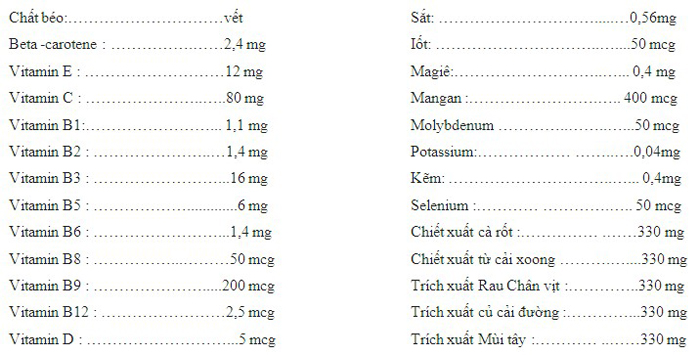 Hàm lượng trong 4 thìa café ~ 20ml bao gồm: