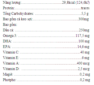 - Thành phần: Nước tinh khiết, siro cây thùa 40%, 15% keo sợi, chiết xuất tự nhiên từ quả mâm xôi(cho: maltodextrin), dầu cá tự nhiên đã khử mùi có chứa DHA, vitamin E – chống oxy hóa, mùi thơm tự nhiên\(maltodextrin, cây keo), vitamin C, vitamin A, vitamin D, chất nhũ tương: este axit béo, potassium sorbate, vitamin E acetate, magnesium gluconat, vitamin A acetate, sodium phosphate. Dẫn xuất tự nhiên của cá và đậu nành.