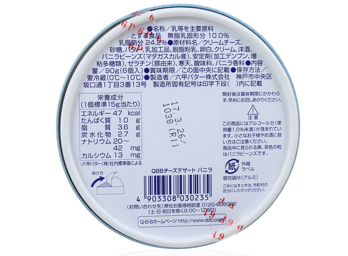 - Thành phần: Kem pho mát, đường, bơ, các sản phẩm sữa chế biến, sữa bột tách kem, trứng màu trắng, kem, rượu, đậu vani (Madagascar), chất ổn định, gelatin, agar, acidulant, vanilla hương liệu.