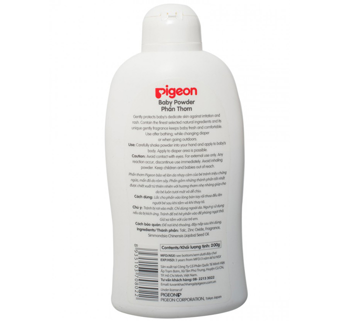 - Phấn thơm Pigeon 100g giúp bảo vệ làn da bé chống lại sự ngứa ngáy do rôm sẩy.