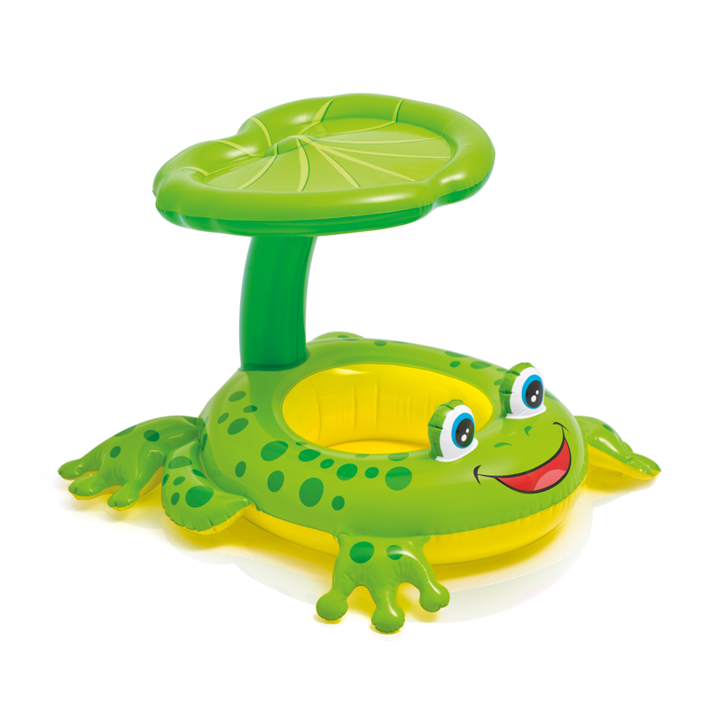 Phao bơi có mái che Intex 56584 - hình ếch xanh với thiết kế xỏ chân, giữ an toàn cho bé khi xuống nước. Phao bơi có thiết kế mái che giúp bé tránh được ánh nắng mặt trời bảo vệ da bé chống tia cực tím, mẹ có thể yên tâm để bé đùa nghịch ngoài trời.