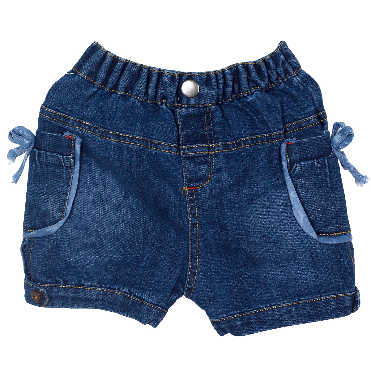 - Kiểu quần cộc với điểm nhấn nơ gắn ở 2 túi bên canh, bé có thể phối hợp với áo thun, áo sơ mi,...cùng sandals để bé trông thật đáng yêu.