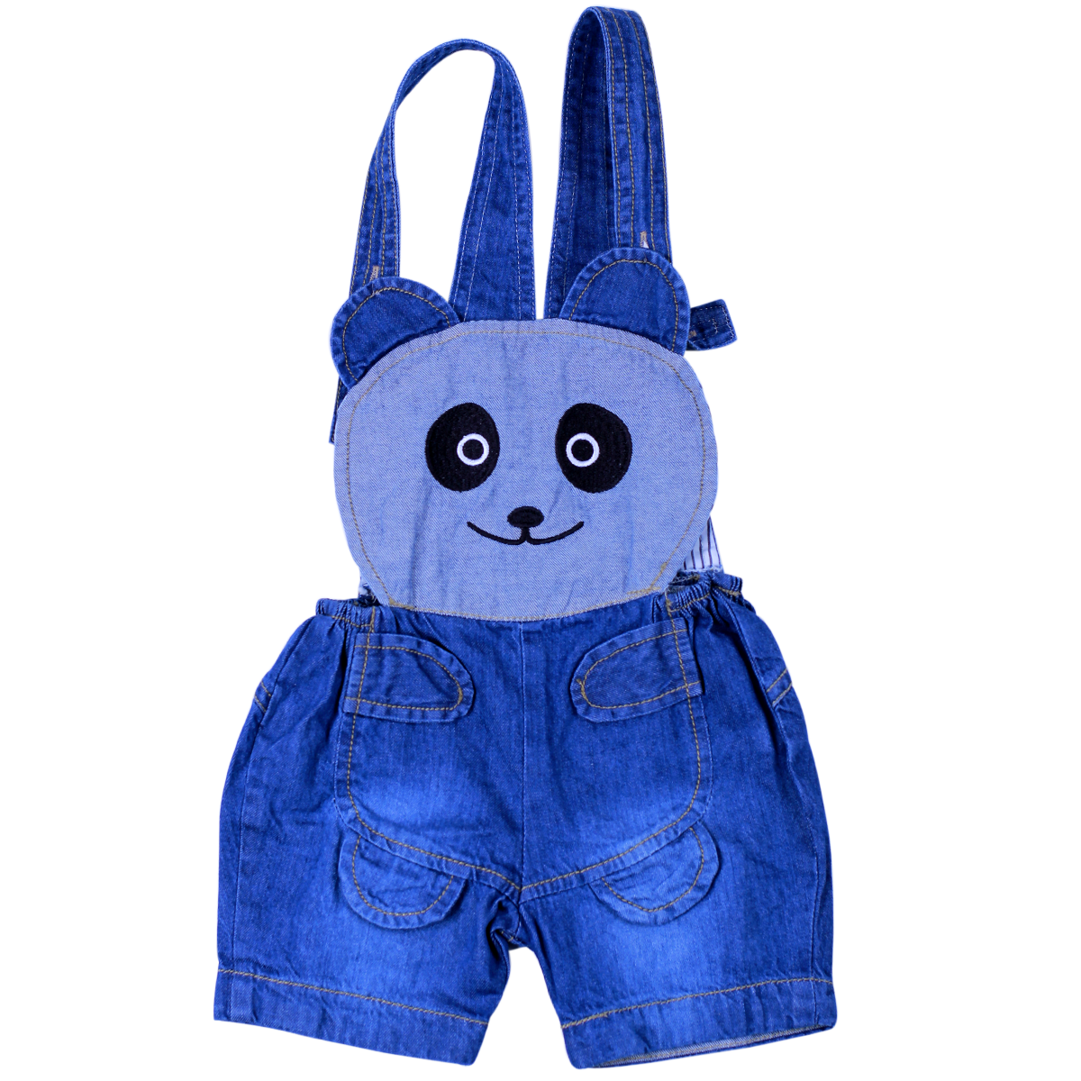 Quần yếm jean dạng cộc màu xanh dương, kết hợp mặt hình gấu xinh xắn.