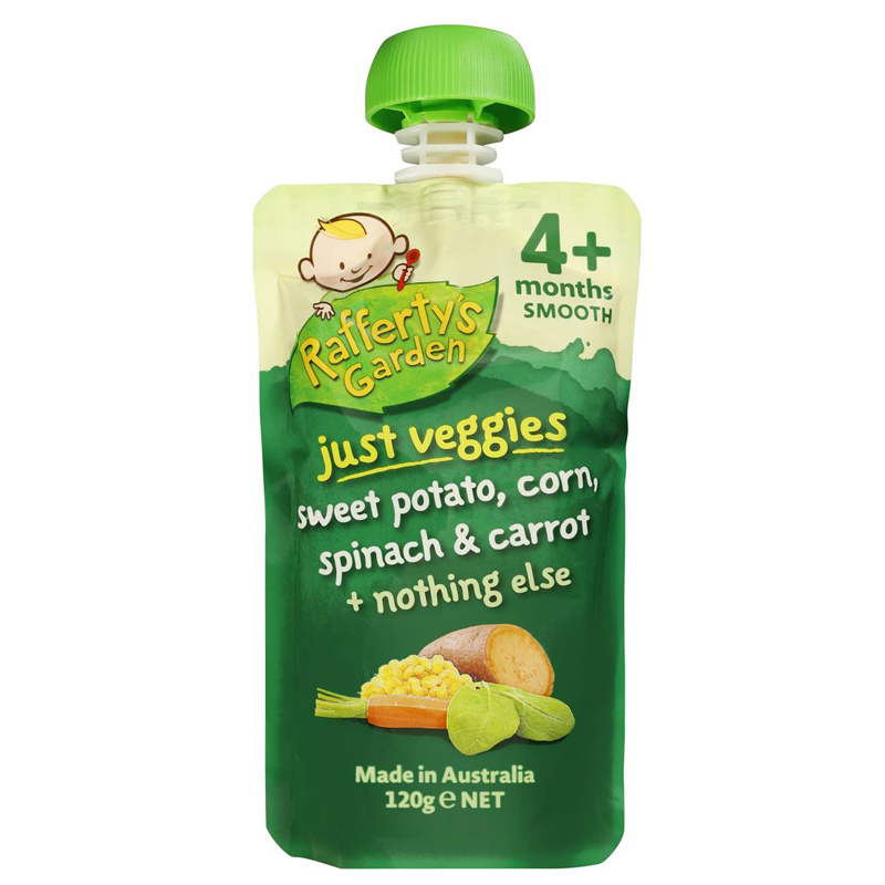 Với loại rau củ quả trồng theo phương pháp hữu cơ, không chứa thành phần biến đổi gen, rau củ xay mịn Rafferty's Garden - Khoai lang, bắp, rau bina, carot (4m+) là thực phẩm bổ sung dành cho bé từ 4 tháng trở lên. Sản phẩm được xay nhuyễn, không bổ sung thêm bất cứ chất nào, giữ nguyên hương vị tự nhiên cho bé.