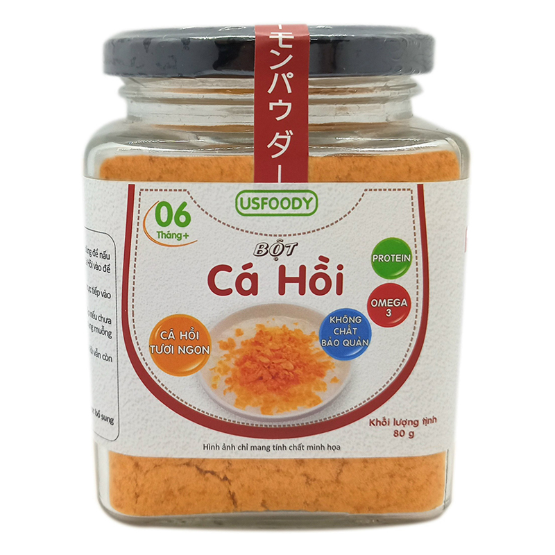 Ruốc cá hồi cao cấp US Food 80g giàu hàm lượng Protein và Omega-3 nguyên chất tự nhiên từ cá hồi, rất tốt cho trí não, thị giác và tốt cho hệ tiêu hóa của trẻ. Sản phẩm có thể cho luôn vào cháo rau củ hoặc cháo trắng, như vậy bé đã có một chén cháo ngon và có đầy đủ các dưỡng chất. Với các bé lớn hơn, ruốc có thể ăn kèm luôn với cơm, với bánh mì… cũng rất ngon. Ngoài ra, bột cá hồi US Food còn được dùng để các mẹ chế biến món cơm cuộn, cơm rang, salad cùng nhiều món ăn hấp dẫn khác cho cả gia đình.