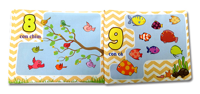 - Mỗi trang sách là một số đếm khác nhau, cùng cách thế hiện sinh động ứng với từng con số sẽ được diễn tả với số lượng đồ vật và con vật tương ứng.