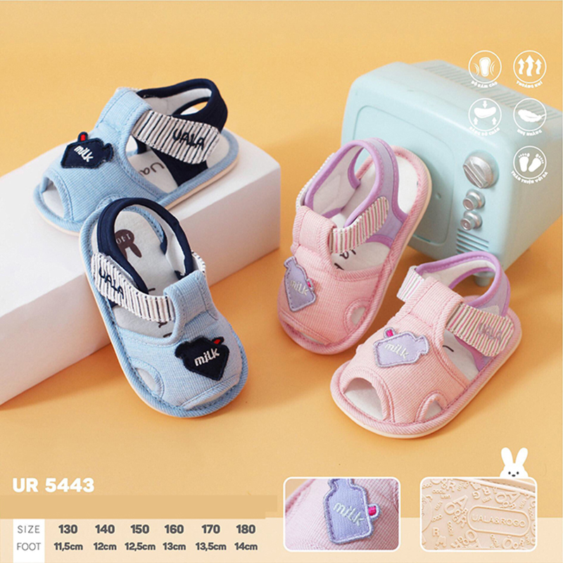 Sử dụng từ chất liệu vải mềm kết hợp với đế bằng cao su chống trơn trượt, sandal tập đi đế cao su non Uala UR5443 mang đến cảm giác thoải mái, không bị bít chân. Kiểu sandal mũi hở với khóa dính velcro tiện lợi, để mẹ có thể điều chỉnh theo form bàn chân của bé.