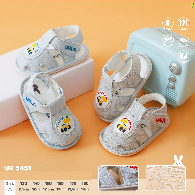 Sandal tập đi đế cao su non Uala UR5451 với thiết kế mũi rọ hở cho bé thoải mái mang khi thời tiết nóng nực đồng thời tránh việc chân của bé bị đẩy lên phía trước. Chất vải mềm mại kết hợp với đế cao su non êm ái cùng đường chỉ may tỉ mỉ tất cả những ưu điểm đó đã khẳng định chất lượng vượt trội của sản phẩm.