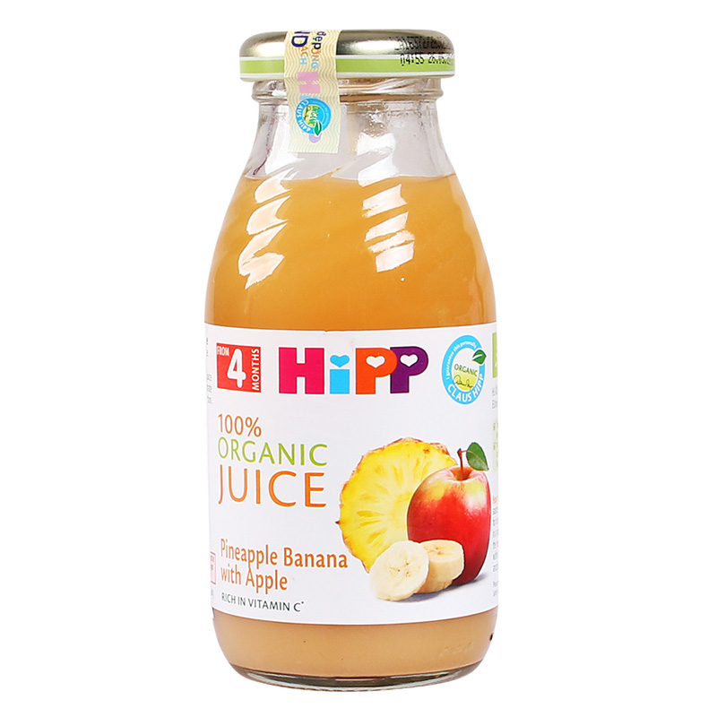 - Thành phần: Nước ép trái cây (nước ép táo nguyên chất với nồng độ axit thấp, nước dứa ép nguyên chất cô đặc, chuối nghiền), Vitamin C, không chứa Gluten. Sản phẩm không chứa chất bảo quản, không phẩm màu.
