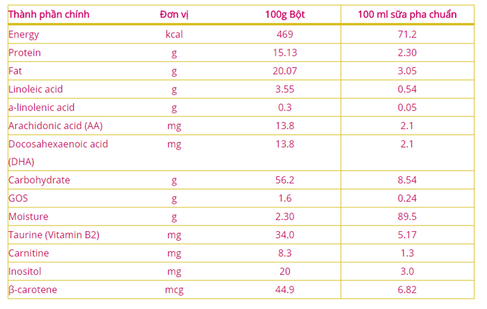 - Thành phần: Sữa tách béo 18.3%, Lactose, dầu thực vật (dầu hướng dương giàu Acid Oleic, dầu đậu nành, dầu dừa), đạm Whey, GOS, khoáng chất (Kali Citrat, Canx Carbonat, Magie Clorid...), Vitamin...
