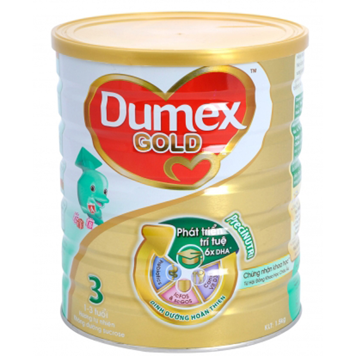 Sữa bột Dumex Gold số 3 1,5 kg phù hợp với bé từ 1 -3 tuổi giúp bé tăng cường hệ miễn dịch tối ưu. Ở giai đoạn từ 1 – 3 tuổi, trẻ cần thêm rất nhiều chất dinh dưỡng để phục vụ quá trình học hỏi và tiếp thu kiến thức từ thế giới bên ngoài. Giúp bổ sung đầy đủ DHA, Canxi, Vitamin D3, Sắt cho bé một cơ thể khỏe mạnh. Sữa có hương vị thơm ngon giúp bé uống ngon hơn, uống nhiều hơn. Được bổ sung hàm lượng DHA cao gấp 6 lần (trong chuẩn khuyên dùng của Hội đồng Khoa học Châu Âu), hỗ trợ trẻ phát triển tối đa thị giác và hoàn thiện chức năng não bộ, giúp trẻ thêm khỏe mạnh và thông minh. Công thức Prebiotics là phát minh khoa học của tập đoàn Danone, được cấp bằng độc quyền sáng chế quốc tế của hội đồng khoa học Châu Âu, nâng cao khả năng miễn dịch.