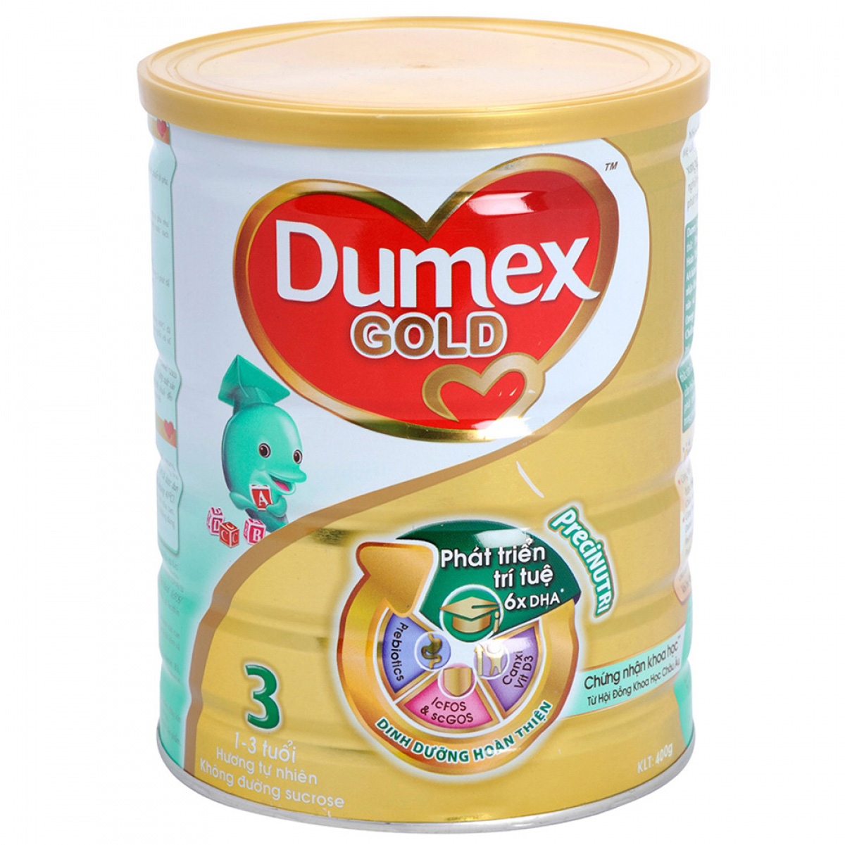 Sữa bột Dumex Gold số 3 400g phù hợp với bé từ 1 -3 tuổi giúp bé tăng cường hệ miễn dịch tối ưu. Ở giai đoạn từ 1 – 3 tuổi, trẻ cần thêm rất nhiều chất dinh dưỡng để phục vụ quá trình học hỏi và tiếp thu kiến thức từ thế giới bên ngoài. Giúp bổ sung đầy đủ DHA, Canxi, Vitamin D3, Sắt cho bé một cơ thể khỏe mạnh. Sữa có hương vị thơm ngon giúp bé uống ngon hơn, uống nhiều hơn. Được bổ sung hàm lượng DHA cao gấp 6 lần (trong chuẩn khuyên dùng của Hội đồng Khoa học Châu Âu), hỗ trợ trẻ phát triển tối đa thị giác và hoàn thiện chức năng não bộ, giúp trẻ thêm khỏe mạnh và thông minh. Công thức Prebiotics là phát minh khoa học của tập đoàn Danone, được cấp bằng độc quyền sáng chế quốc tế của hội đồng khoa học Châu Âu, nâng cao khả năng miễn dịch.