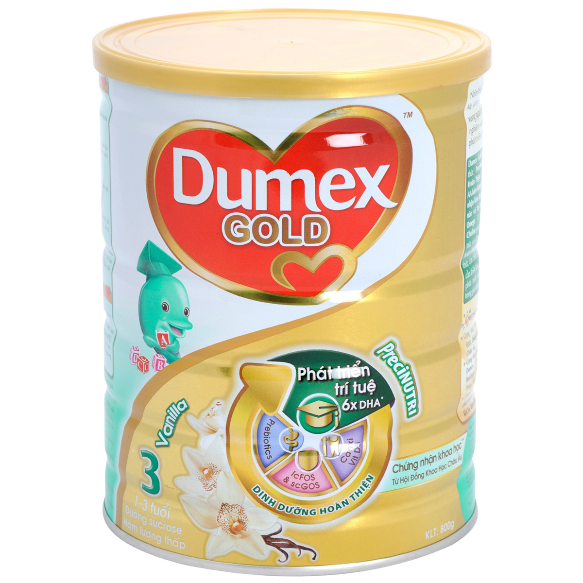 Sữa bột Dumex Gold số 3 800g phù hợp với bé từ 1 -3 tuổi giúp bé tăng cường hệ miễn dịch tối ưu. Ở giai đoạn từ 1 – 3 tuổi, trẻ cần thêm rất nhiều chất dinh dưỡng để phục vụ quá trình học hỏi và tiếp thu kiến thức từ thế giới bên ngoài. Giúp bổ sung đầy đủ DHA, Canxi, Vitamin D3, Sắt cho bé một cơ thể khỏe mạnh. Sữa có hương vị thơm ngon giúp bé uống ngon hơn, uống nhiều hơn. Được bổ sung hàm lượng DHA cao gấp 6 lần (trong chuẩn khuyên dùng của Hội đồng Khoa học Châu Âu), hỗ trợ trẻ phát triển tối đa thị giác và hoàn thiện chức năng não bộ, giúp trẻ thêm khỏe mạnh và thông minh. Công thức Prebiotics là phát minh khoa học của tập đoàn Danone, được cấp bằng độc quyền sáng chế quốc tế của hội đồng khoa học Châu Âu, nâng cao khả năng miễn dịch.