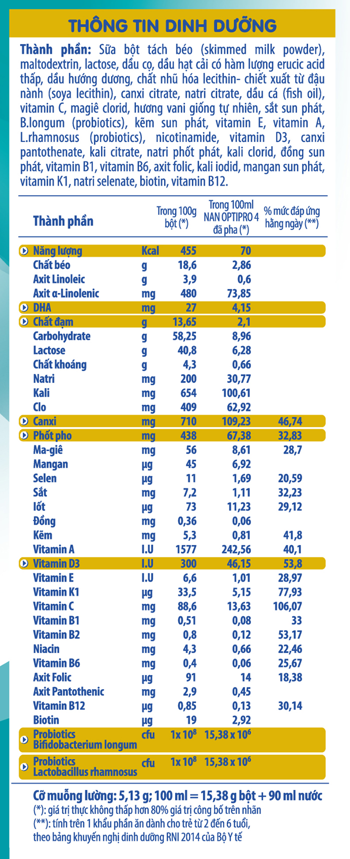 Sản phẩm cung cấp optipro cho bé phát triển chiều cao, ngoài ra sữa bột Nan Optipro số 4 Probiotics có hàm lượng sắt cao có tác dụng làm giảm nguy cơ thiếu máu cho bé.