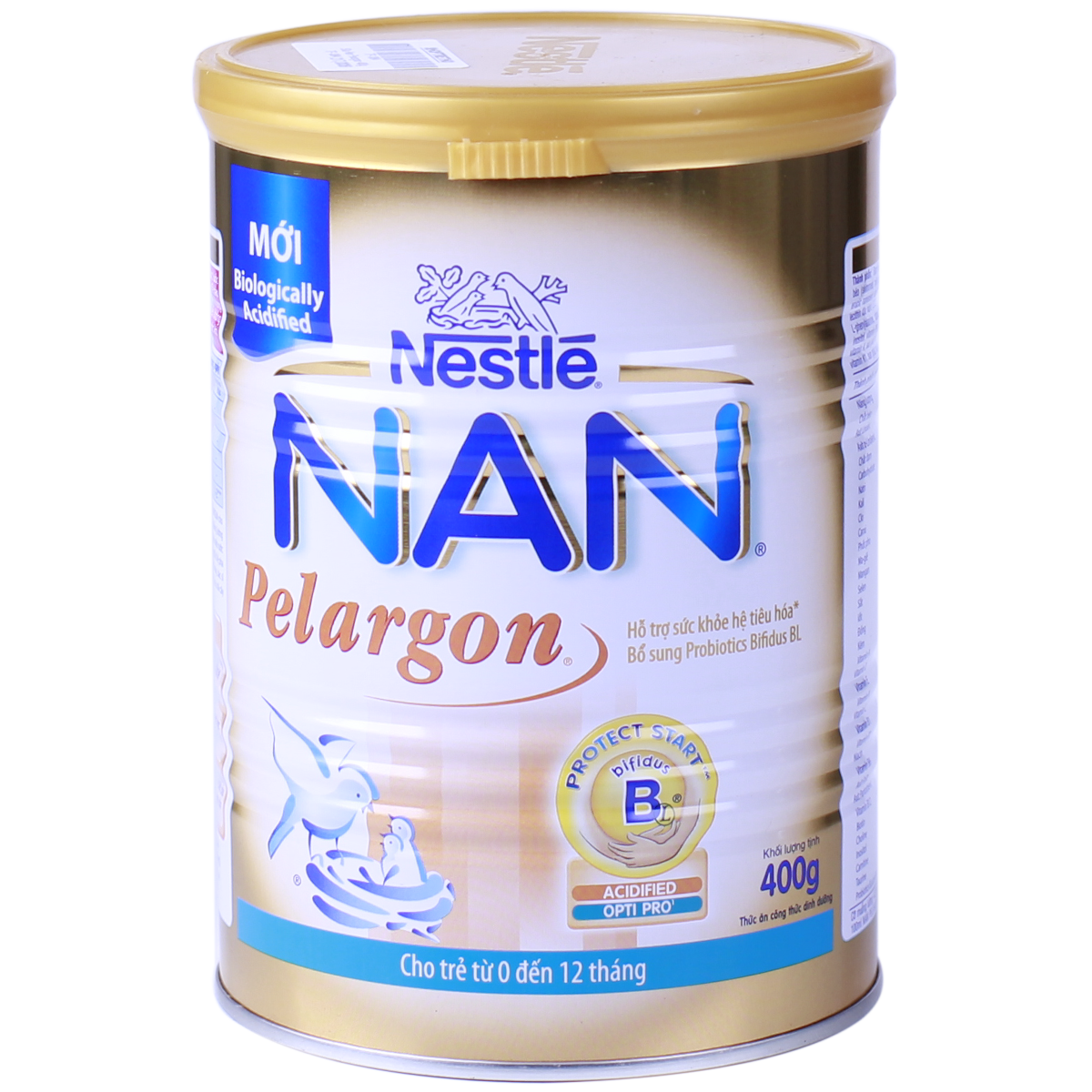 Sữa bột Nestle Nan Pelargon - 400g là loại sữa có chất liệu an toàn từ chính những dinh dưỡng từ tự nhiên và chế biến từ sữa bò nguyên kem với 20% và chất béo này được coi như sữa công thức dành cho trẻ sơ sinh. Với những cách chọn và sử dụng sữa bột Nestle Nan Pelargon 400g là một loại sữa có chất dinh dưỡng với những cách chọn và sử dụng các loại dinh dưỡng tốt nhất cho trẻ, chống các bệnh về đường tiêu hóa sẽ nguy hại đến trẻ do lên men từ vi khuẩn lactic chọn lọc. Sữa bột Pelargon được đánh giá là có thành phần giống như sữa mẹ nên bé trong độ tuổi từ 0 - 12 tháng đều sử dụng được.