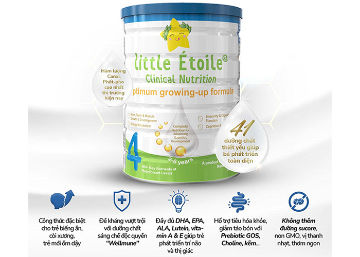 Sữa bột Little Étoile số 4 (2-6 tuổi) 800g được làm từ nguyên liệu cao cấp đã được khoa học kiểm chứng là tốt đối với sự phát triển của bé, đặc biệt nguồn protein đến từ 100% sữa bò Úc được nuôi bằng cỏ kết hợp với kinh nghiêm hơn 20 năm trong lĩnh vực khoa học dinh dưỡng và dược phẩm của đội ngũ nghiên cứu và phát triển sản phẩm. Sữa dành cho bé từ 2-6 tuổi đang phát triển có hàm lượng dinh dưỡng tối ưu vượt trội.