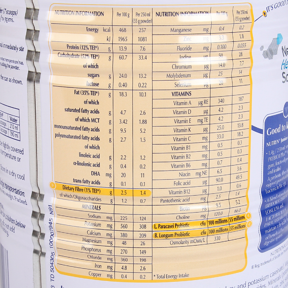 - Công thức cải tiến mới, Nestlé Nutren cung cấp 55 triệu cfu Probiotics và 1.4g chất xơ Prebiotic / 250ml đã pha