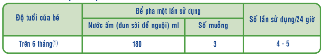 - Dùng nước đã dược đun sôi trong vòng 5 phút và để nguội (37 - 40 độ C), cho chính xác lượng nước ấm cần pha vào bình đã vệ sinh sạch, lường bằng muỗng có sẵn trong hộp.