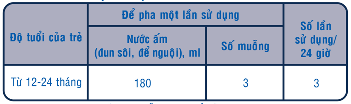 - Dùng nước đã dược đun sôi trong vòng 5 phút và để nguội (37 - 40 độ C), cho chính xác lượng nước ấm cần pha vào bình đã vệ sinh sạch, lường bằng muỗng có sẵn trong hộp.
