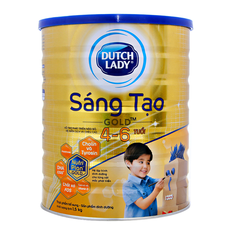 Sữa Dutch Lady Sáng Tạo Gold 1.5kg với hệ lập trình NutriPlan Gold kết hợp đúng và đủ hàm lượng Palatinose, FOS, DHA, Tyrosin, Cholin, Ma-giê, vitamin D, Canxi… và các dưỡng chất thiết yếu phát triển trí não, phát huy sáng tạo, phù hợp cho bé trong giai đoạn từ 4 - 6 tuổi.