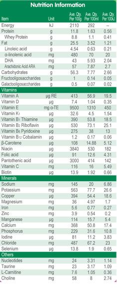 - Thành phần: Bột Whey, dầu thực vật, bột sữa không kem, Lactose, bột whey giàu protein, hy-drát các bon Fructo (FOS), hy-drát các bon Galacto (GOS), axít Arachidonic ARA, DHA, Nucleotides (5’-AMP, 5’-CMP, 5’-GMP, 5’-UMP, 5’-IMP), khoáng chất L-Carnitine, Vitamin A, Vitamin B1, Vitamin B2, Vitamin B6, Vitamin D, Folic Acid, Vitamin K, Vitamin B12, B- Carotene, Niacin, Pantothenic Acid, Vitamin C, Biotin, Choline, Vitamin E, Taurine, đồng, magie, sắt, kẽm, canxi, phốt pho, kali, selen, mangan, chất chuyển thể sữa (lê-xi-tin đậu nành)