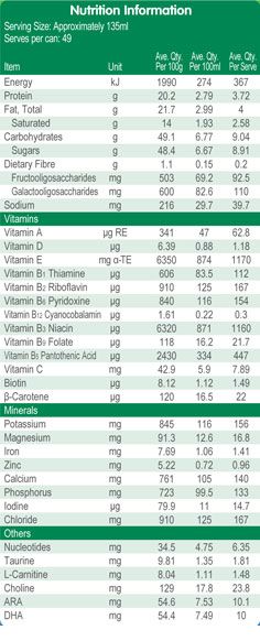 - Thành phần: Bột sữa kem,lactoza, hy-drátcác bon Galacto (GOS), hy-drátcác bon Fructo (FOS), ARA, DHA, Nucleotides (5’- AMP, 5’-CMP, 5’-GMP, 5’-UMP, 5’-IMP), cacnitin-L, VitaminA,Vitamin B1,Vitamin B2,Vitamin B6,Vitamin D, FolicAcid, axítni-cô-ti-ích, Vitamin E, sắt, kẽm, can-xi, phốt-pho, kali, i-ốt, chấtchuyểnthểsữa (lê-xi-tin đậu nành).