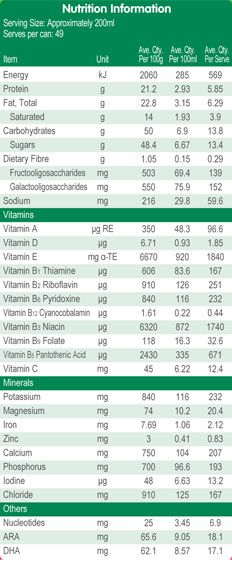 - Thành phần: Bột sữa kem,lactoza, hy-drátcác bon Galacto (GOS), hy-drátcác bon Fructo (FOS), ARA, DHA, Nucleotides (5’- AMP, 5’-CMP, 5’-GMP, 5’-UMP, 5’-IMP), cacnitin-L, VitaminA,Vitamin B1,Vitamin B2,Vitamin B6,Vitamin D, FolicAcid, axítni-cô-ti-ích, Vitamin E, sắt, kẽm, can-xi, phốt-pho, kali, i-ốt, chấtchuyểnthểsữa (lê-xi-tin đậu nành).