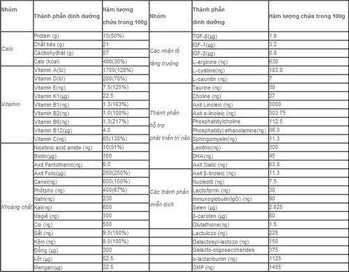 - Các thành phần miễn dịch bao gồm axit β-linoleic và nucleotide, vv…