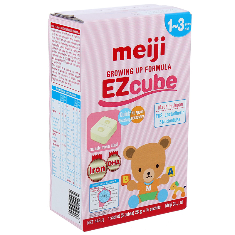 Sữa Meiji Growing Up Formula EZcube (16 thanh) được nhập khẩu từ Nhật Bản dành cho bé từ 1 đến 3 tuổi. Sữa Meiji số 9 không chỉ chứa các chất dinh dưỡng cơ bản, như protein, chất béo và carbohydrat, mà sản phẩm còn có các vitamin và khoáng chất (rất khó có thể tìm thấy trong thức ăn dạng rắn, sữa bò hay sữa mẹ). Sữa cũng chứa cả axit docosahexaenoic (DHA), nucleotides và fructooligosaccharides, giúp thúc đẩy sự phát triển khỏe mạnh của bé trong những năm tháng đầu đời.