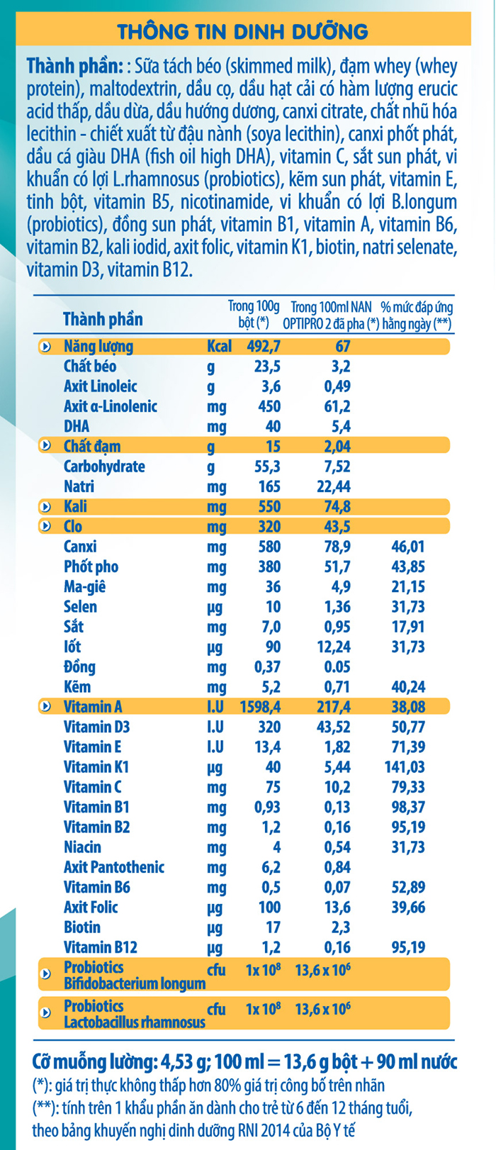 Lactose, sữa tách béo (Skimmed milk powder), đạm whey, dầu cọ, dầu low erucic rapeseed, dầu dừa, dầu hướng dương, citrate caxi, lecithin đậu nành (soya lecithin), phốt phát kali, dầu cá (fish oil: nguồn DHA), Vitamin C, dầu Mortierella Alpina (nguồn ARA), sunfat sắt, các nucleotide, B.Longum (Optiprobiotic), sunfat kẽm, Vitamin E, L.Rhamnosus (Optiprobiotic), phantothenate canxi, vitamin PP, vitamin A, vitamin B1, sunfat đồng, vitamin B6, vitamin B2, iodua kali, axit Folic, vitamin K1, Biotin, selenate natri, Vitamin D3, vitamin B12.
