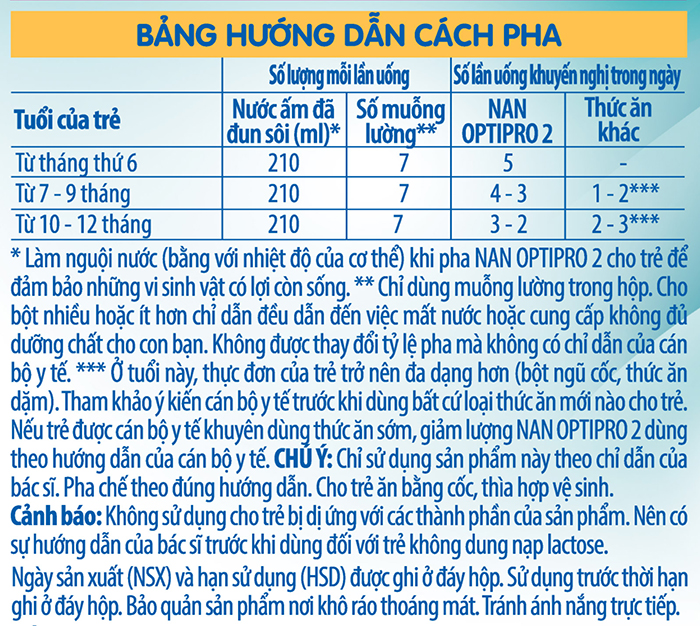 Một muỗng gạt ngang pha với 30ml nước ấm, chỉ dùng muỗng đi theo hộp, điều chỉnh lượng nước và sữa theo bảng phù hợp với nhu cầu của trẻ.