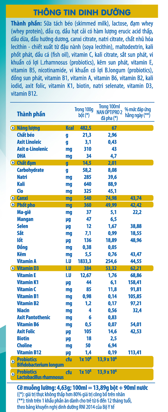 Sữa Nan Optipro 2 bổ sung Optiprobiotics là những vi sinh vật có lợi nhằm hỗ trợ hệ miễn dịch và cung cấp lượng chất đạm cần thiết cho sự phát triển của trẻ.