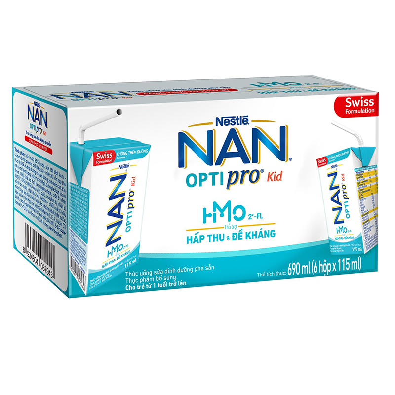 Sữa công thức pha sẵn Nestle Nan Optipro Kid với dung tinh 115ml/hộp, phù hợp với nhu cầu uống 1 lần của bé