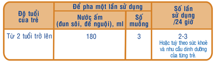 - Dùng nước đã dược đun sôi trong vòng 5 phút và để nguội (37 - 40 độ C), cho chính xác lượng nước ấm cần pha vào bình đã vệ sinh sạch, lường bằng muỗng có sẵn trong hộp.