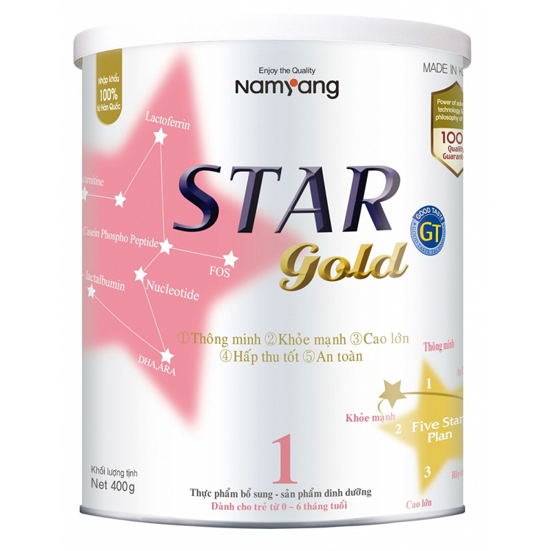 Sữa Star Gold số 1 là sản phẩm dinh dưỡng cao cấp được nhập khẩu nguyên từ Namyang - Tập đoàn bơ sữa số 1 Hàn Quốc dành cho trẻ từ 0 - 6 tháng tuổi. Với 54 thành phần dưỡng chất cao cấp trong đó có đến 5 thành phần được tìm thấy trong sữa non như sIgA, IgG, EgF, TGF-β, IGF, sữa Star Gold có bổ sung đầy đủ các dưỡng chất thiết yếu với hàm lượng cân đối giúp hình thành và tăng cường khả năng miễn dịch của trẻ, thúc đẩy quá trình tăng trưởng. Sản phẩm sử dụng 100% bột sữa nguyên chất được làm từ nguồn sữa tươi lấy tại nông trại, không qua khâu lưu kho, sử dụng phương pháp hút chân không để giữ trọn nguồn dinh dưỡng phong phú và duy trì hương vị tươi mới của sản phẩm.
