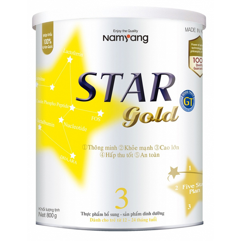 Được tập đoàn NamYang - Hàn Quốc nghiên cứu phát triển cho trẻ trên 12 tháng tuổi, sữa Star Gold số 3 với 54 thành phần dưỡng chất cao cấp bổ sung đầy đủ các dưỡng chất thiết yếu với hàm lượng cân đối giúp hình thành và tăng cường khả năng miễn dịch của trẻ, thúc đẩy quá trình tăng trưởng. Sản phẩm sử dụng 100% bột sữa nguyên chất được làm từ nguồn sữa tươi lấy tại nông trại, không qua khâu lưu kho, sử dụng phương pháp hút chân không để giữ trọn nguồn dinh dưỡng phong phú và duy trì hương vị tươi mới.