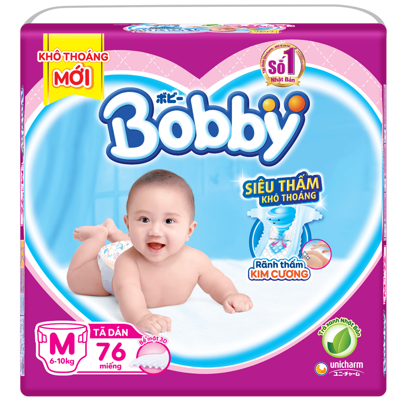 Tã - bỉm Bobby M76 (siêu mỏng) là loại tã giấy được thiết kế hoàn toàn mới siêu mỏng nhưng siêu thấm, thoáng nhẹ cho ngày nóng bức. Bịch đại 76 miếng size M cho bé từ 6 -10kg, tiết kiệm cho mẹ và bé dùng được lâu hơn. Không giống như các bỉm thông thường, sản phẩm Bobby Fresh được tăng cường tinh chất trà xanh cực thơm mát, giúp cho bé luôn an toàn trong 6 tiếng mà không hề bị hăm da hay nhiễm khuẩn.